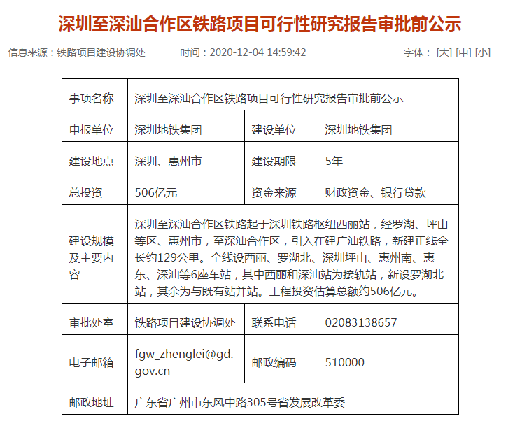 2020年12月4日,广东省发改委发布了《深圳至深汕合作区铁路项目可行性研究报告审批前公示》,这预示着深汕高铁项目可研即将批复,即将进入正式实施阶段。