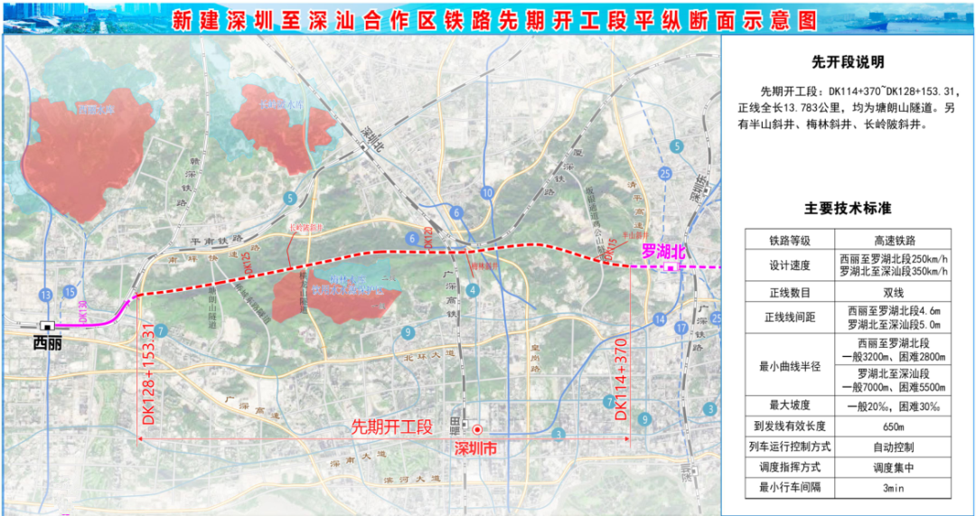 深圳至深汕合作区铁路起于深圳铁路枢纽西丽站,经罗湖、坪山等区、惠州市,至深汕合作区,引入在建广汕铁路,新建正线全长约129公里。全线设西丽、罗湖北、深圳坪山、惠州南、惠东、深汕等6座车站,其中西丽和深汕站为接轨站,新设罗湖北站,其余为与既有站并站。