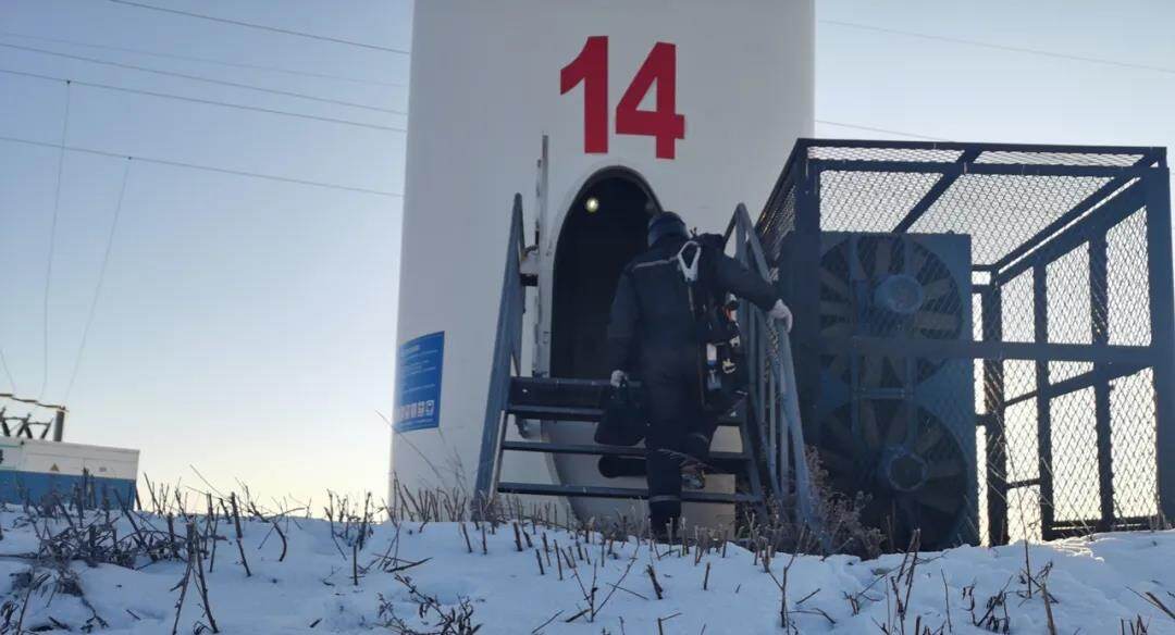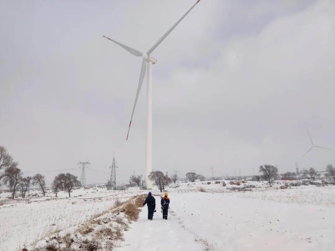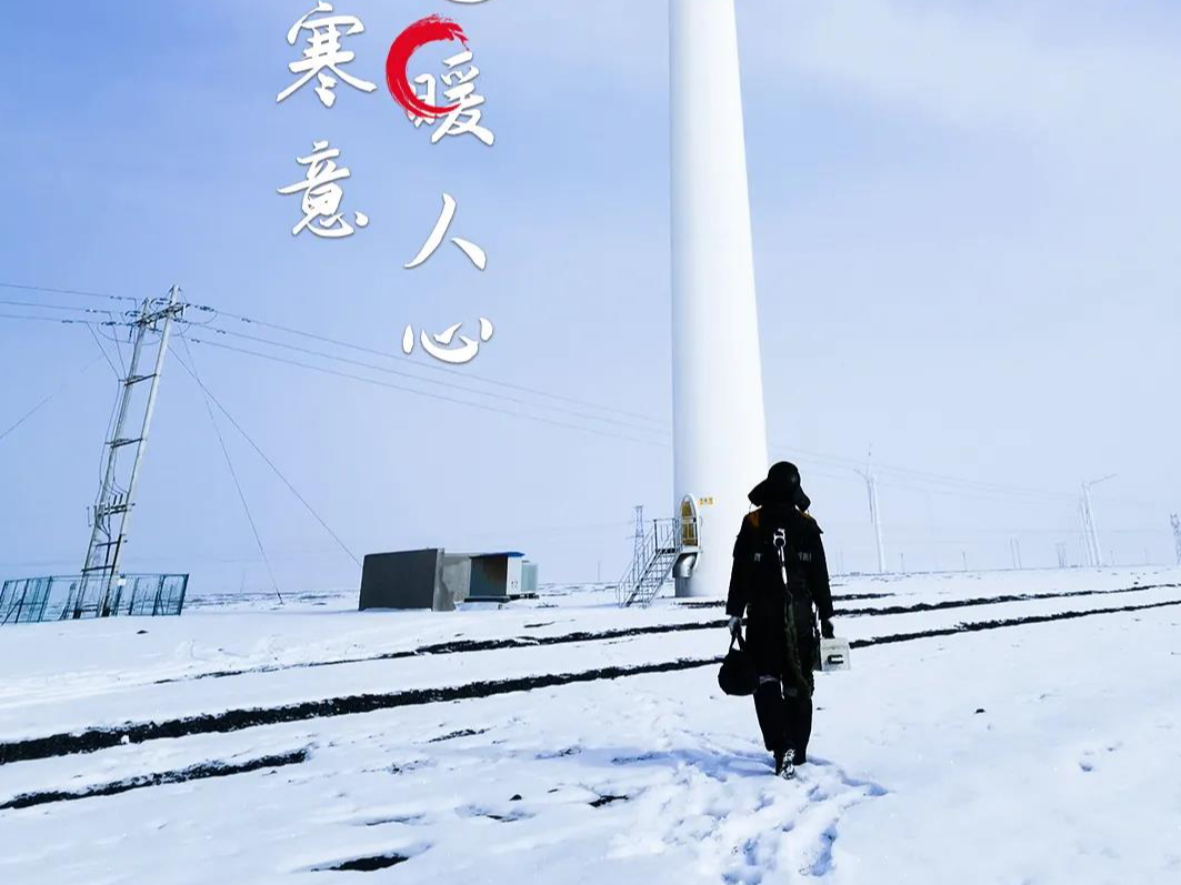 中广核察北风电场零下20℃的环境下,为保证风机稳定运行,运维检修员工拿着设备、戴着安全帽、穿着工作服,在风雪中忙碌。尚义风电场对积雪道路进行清理,为安全生产保驾护航。
