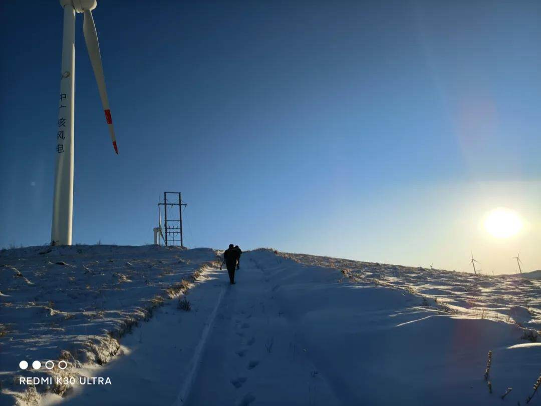 因突如其来的暴雪,中广核沽源风电场积雪严重,本就路况不佳的检修道路更加步履维艰,设备及线路的巡视工作也更加艰难。车陷于雪中,场站检修人员就下车清雪为车开路;车辆无法通行的地方,他们就趟着厚厚的积雪继续进行。