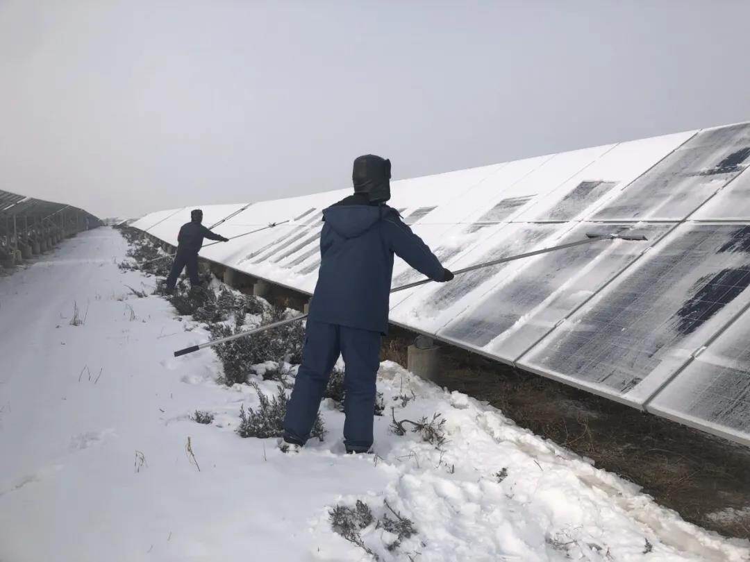 中广核横山电站为避免大雪低温天气导致光伏组件发电性能降低,及时组织电站员工清理组件表面积雪,确保组件正常发电。