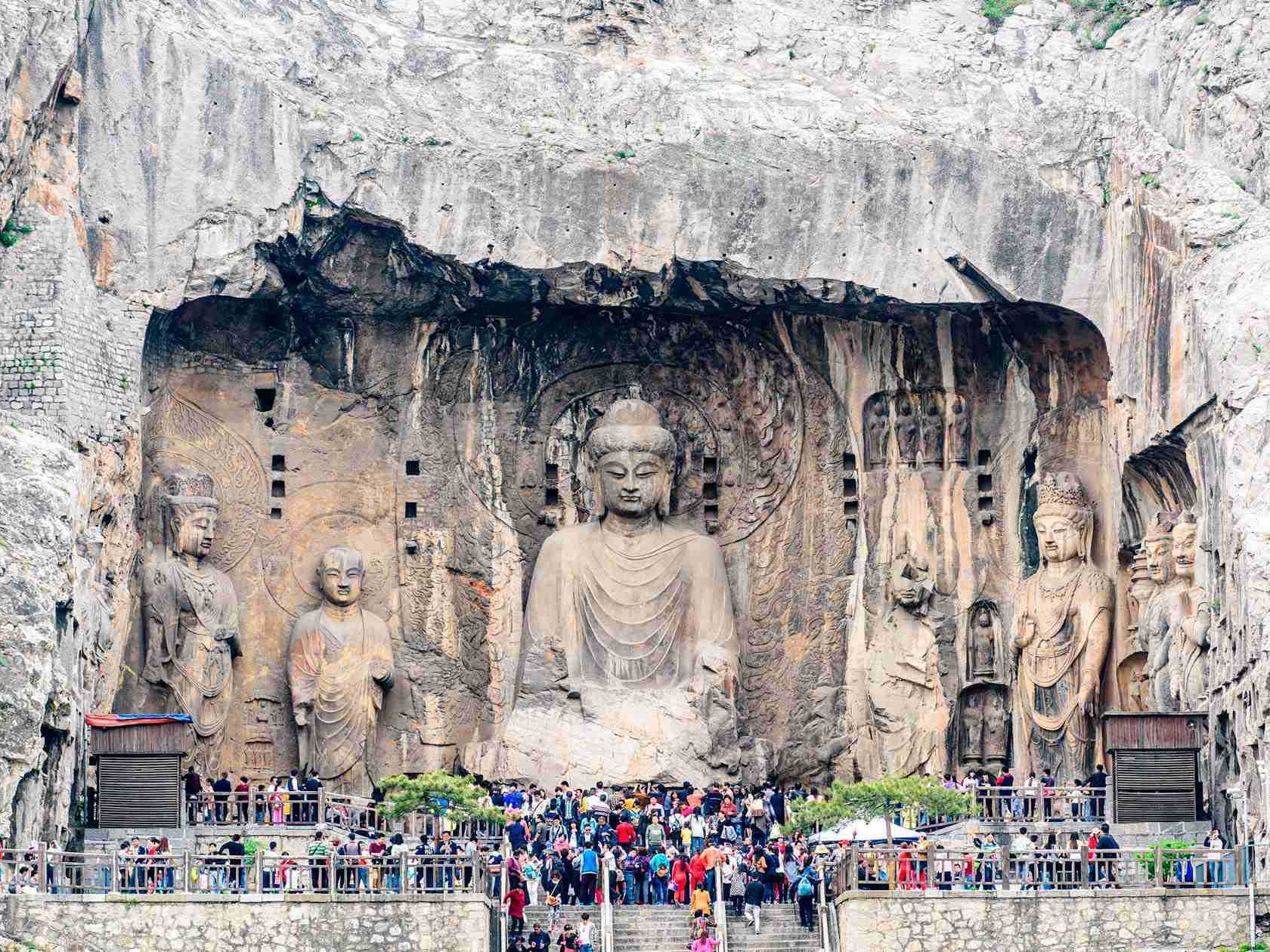 这是一个令人难以想象的计划,营造者要在龙门西山山腰处开凿出一个南北宽约三十六米,东西进深四十多米的佛龛,佛龛内列有九尊大像,最高的主佛卢舍那高达十七米多,他将是龙门石窟历史上最为宏伟的佛像。