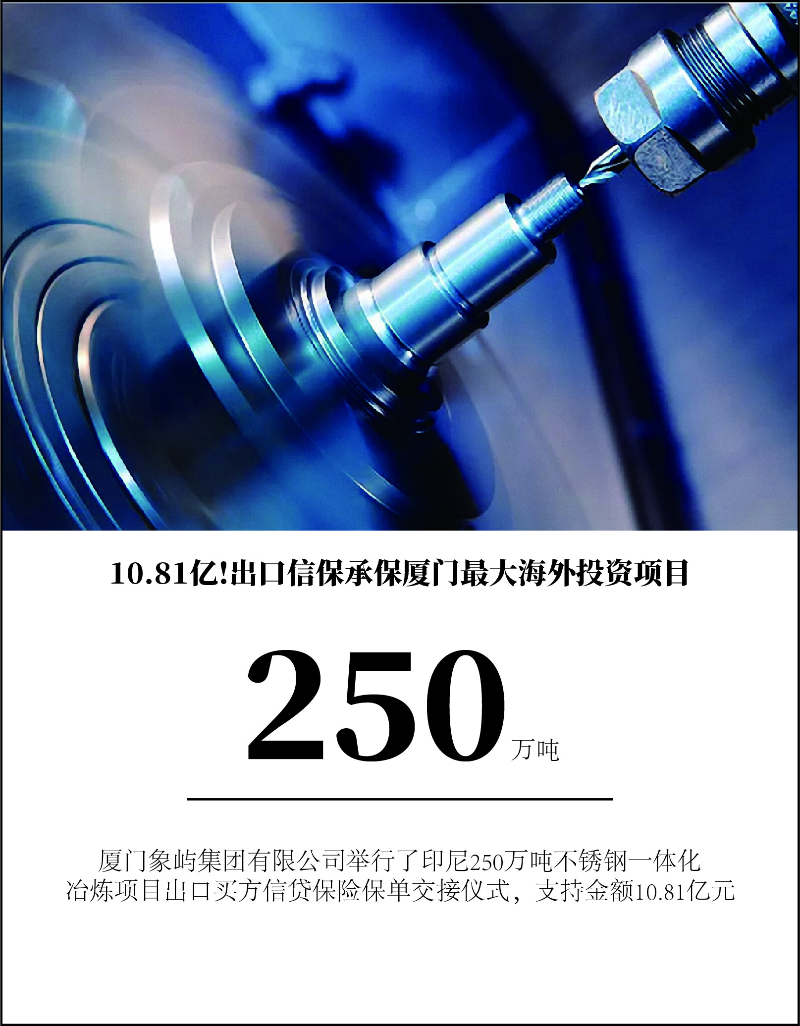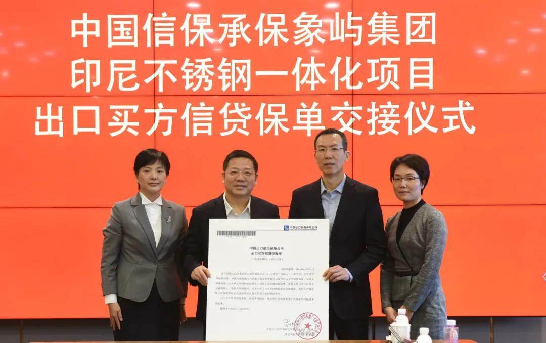 2020年12月9日,中国出口信用保险公司党委委员、副总经理张辉一行走访厦门象屿集团有限公司。在张总和象屿集团党委副书记、总裁陈方的见证下,举行了印尼250万吨不锈钢一体化冶炼项目出口买方信贷保险保单交接仪式,支持金额10.81亿元。