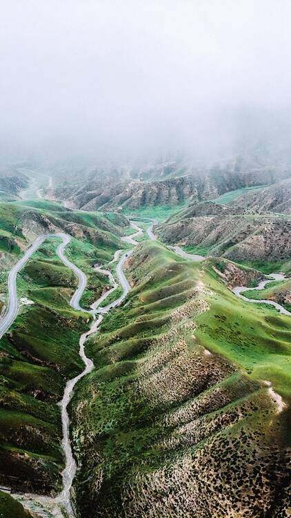 تحت الضباب ، تتعرج المياه الصافية في الوادي ، وتكون الأخاديد على جانبي الوادي معقدة ومزعجة.