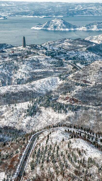 في منطقة Xiaolangdi ذات المناظر الخلابة في Jiyuan ، Henan ، على ضفاف النهر الأصفر ، توجد جبال بعد الاستحمام بالثلج والطرق الجبلية المتعرجة.