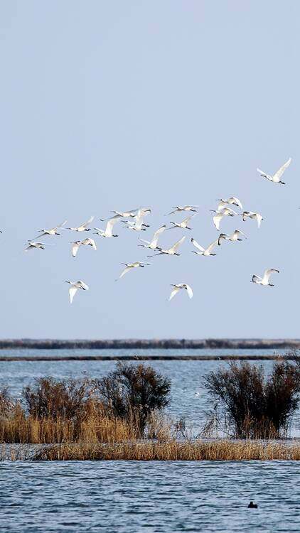 في المحمية الطبيعية الوطنية لدلتا النهر الأصفر في دونغ ينغ ، شاندونغ ، تحوم أسراب الطيور وتلعب للحصول على الطعام في الأراضي الرطبة ، وتنشر آلاف الطيور المهاجرة أجنحتها وتطير معًا.