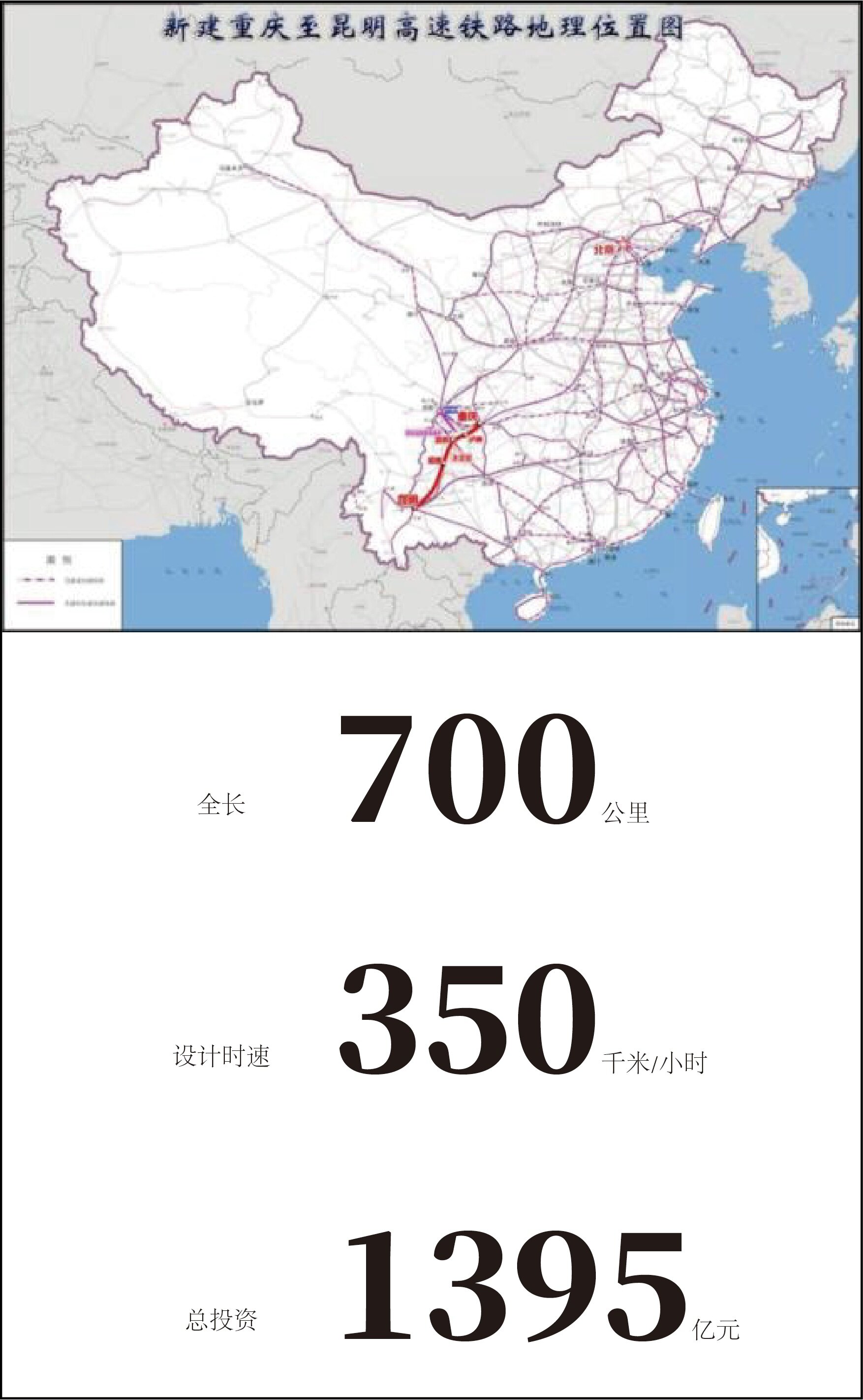 位于重庆、四川、贵州、云南等4省(市)境内,线路全长约700公里,其中,四川境内204公里,设计目标时速350km/h,设泸州、泸州东等21座客运站,预估总投资1395亿元。10月份,京市建设工程信息网发布渝昆高铁(重庆至宜宾段)施工招标公告,计划于2020年12月21日正式开工建设,计划2025年06月20日建成通车,总工期四年半。