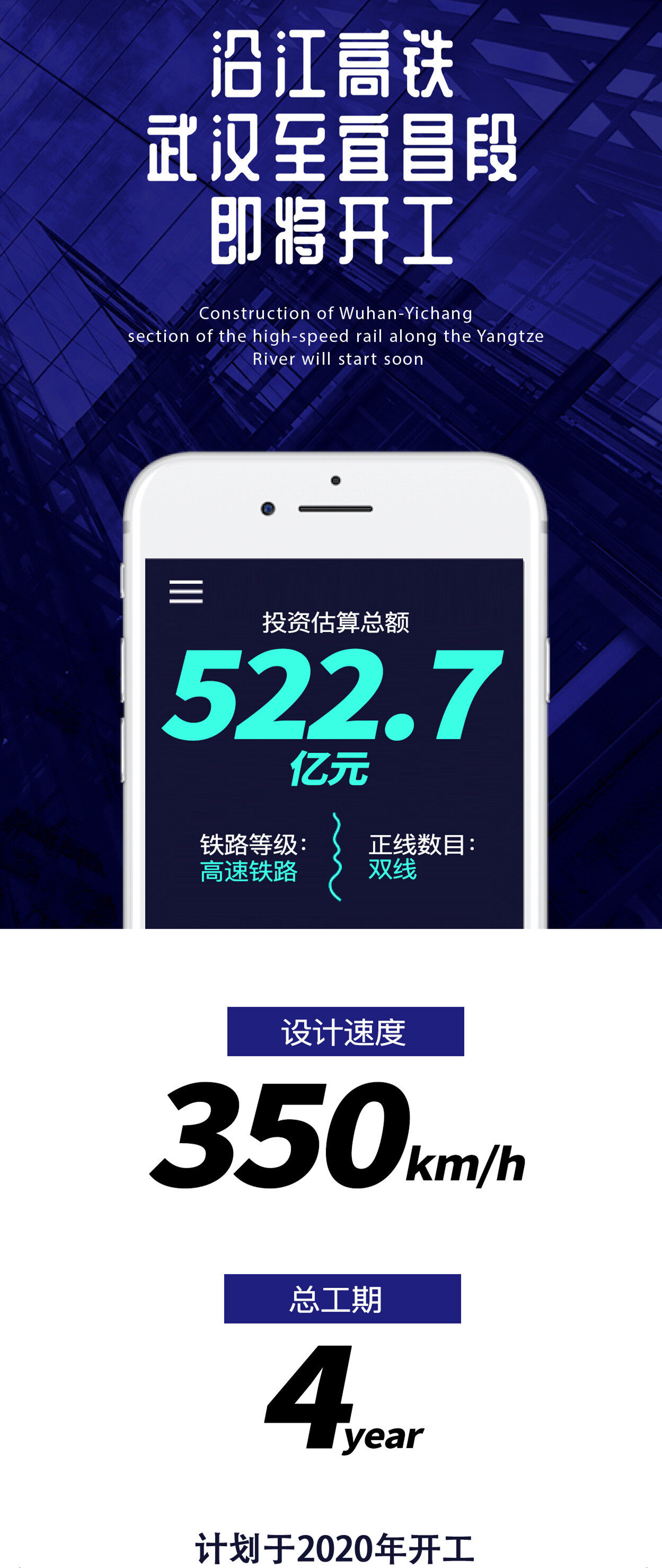 Recently, the National Railway Group and the People's Government of Hubei Province jointly approved the "Feasibility Study Report on the Wuhan-Yichang Section of the New Shanghai-Chongqing-Chongqing High-speed Railway", which means that the project is about to enter the formal implementation stage. The estimated total investment is 52.27 billion yuan, and construction is planned to start in 2020 with a total construction period of 4 years.