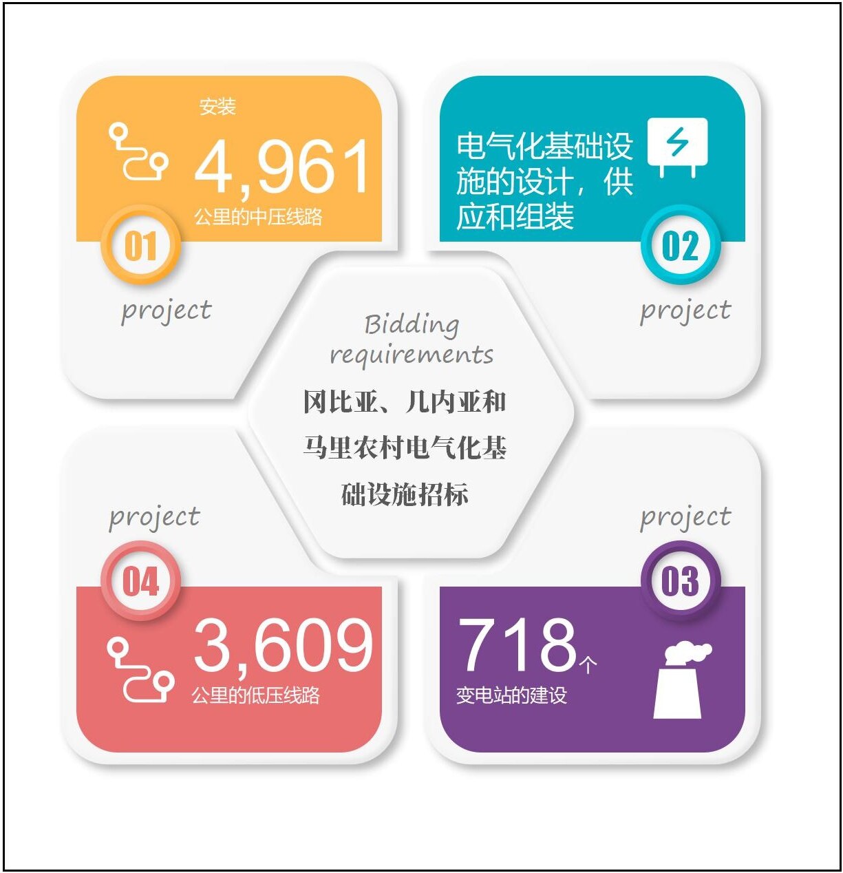 冈比亚、几内亚和马里政府已发起联合招标,要求在冈比亚、几内亚和马里建立农村电气化基础设施。招标要求电气化基础设施的设计,供应和组装,特别是安装4,961公里的中压线路,3,609公里的低压线路以及718个变电站的建设。