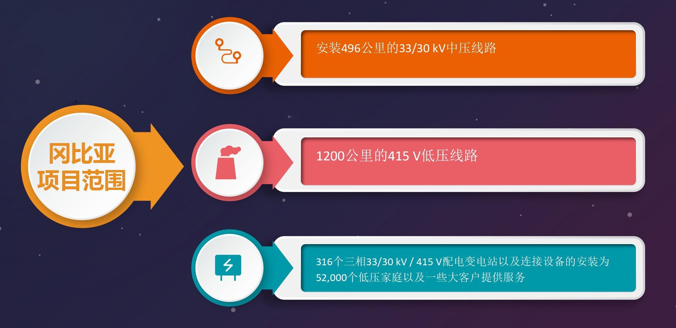 在冈比亚,合同涉及安装496公里的33/30 kV中压线路,1200公里的415 V低压线路,316个三相33/30 kV / 415 V配电变电站以及连接设备的安装为52,000个低压家庭以及一些大客户提供服务。首选公司将有24个月的时间在该国家完成该项目。
