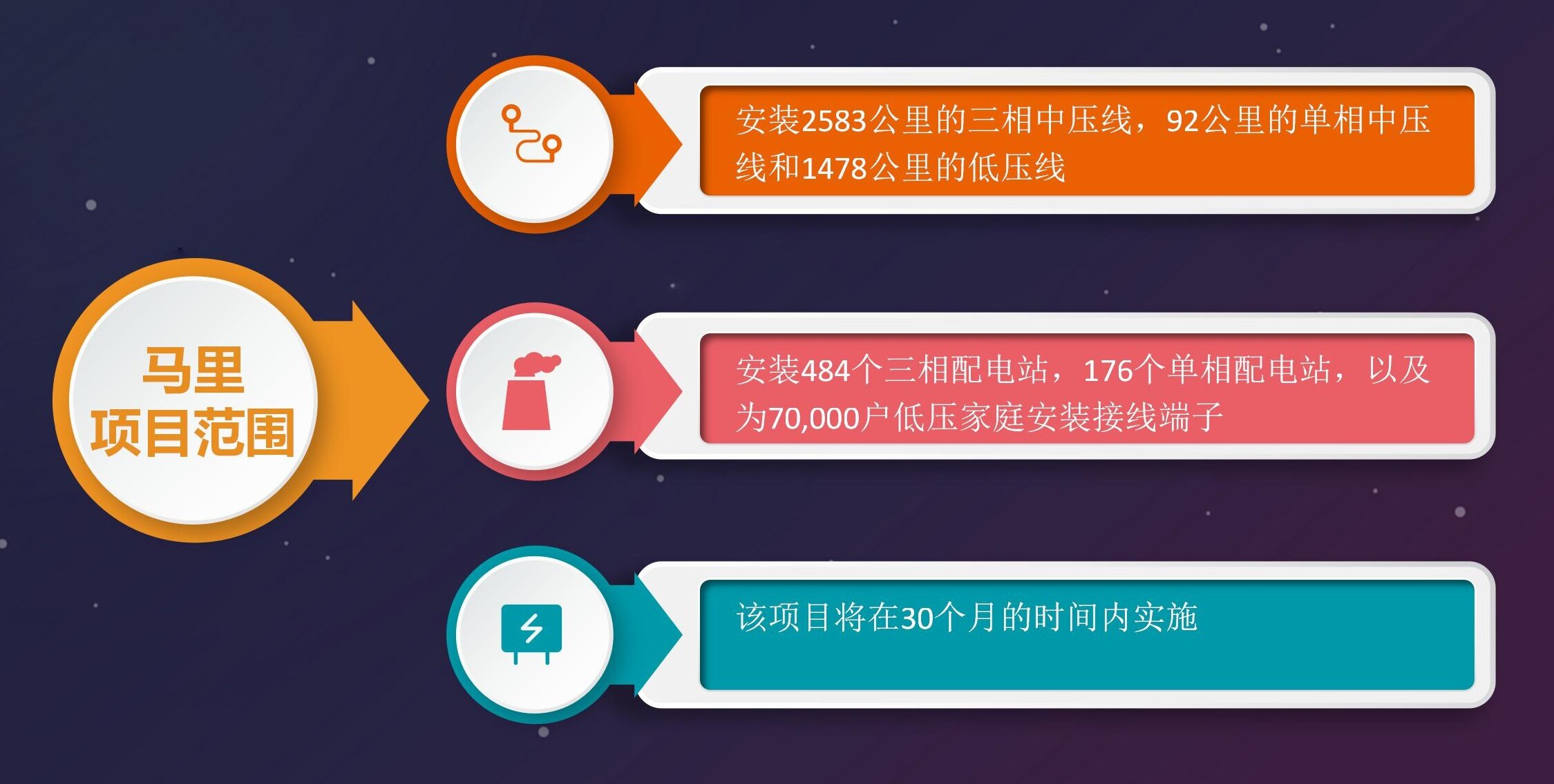 马里的工程将包括安装2583公里的三相中压线,92公里的单相中压线和1478公里的低压线。在这个西非国家的项目还包括安装484个三相配电站,176个单相配电站,以及为70,000户低压家庭安装接线端子。该项目将在30个月的时间内实施。