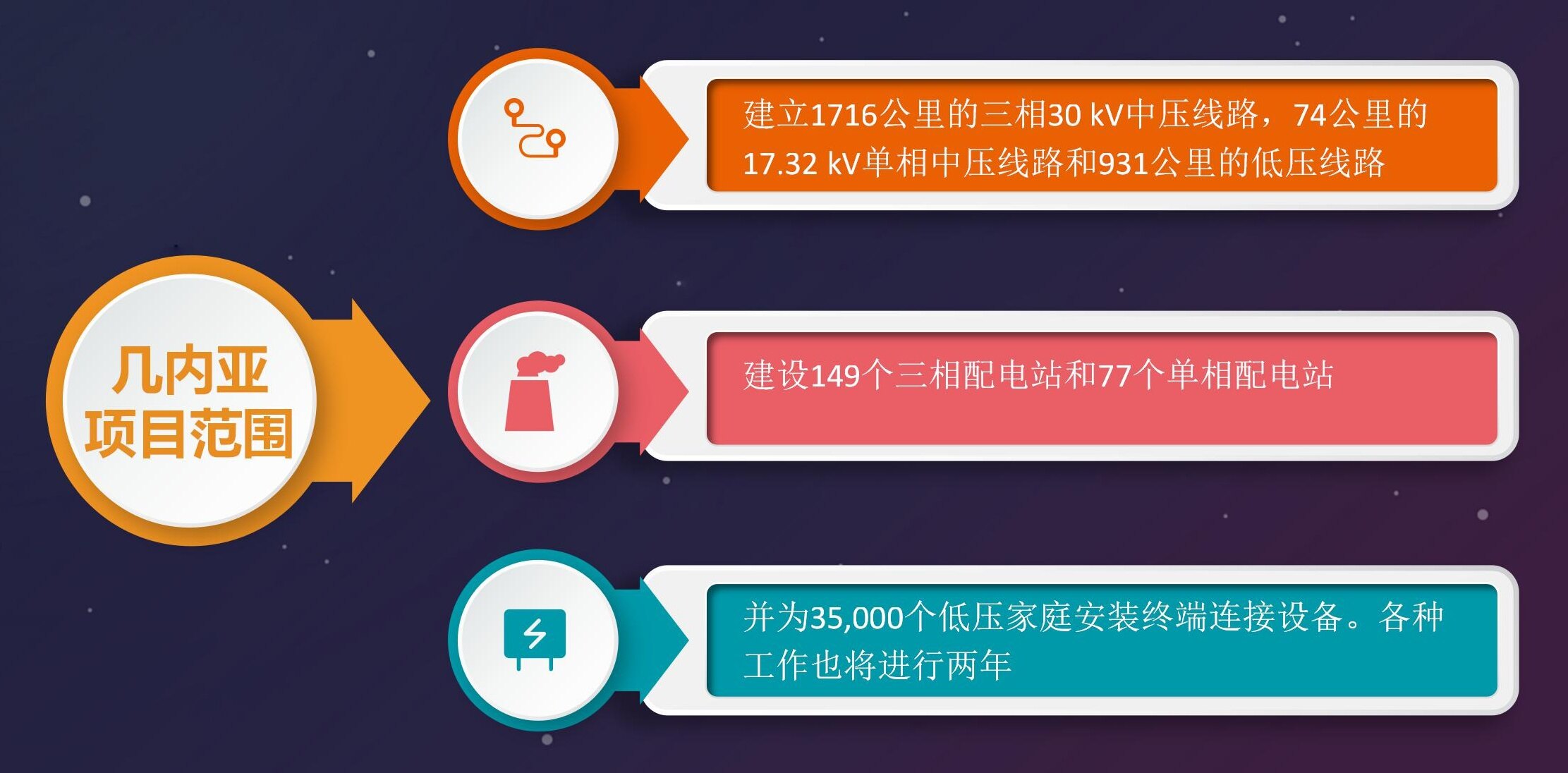 几内亚比绍希望建立1716公里的三相30 kV中压线路,74公里的17.32 kV单相中压线路和931公里的低压线路。还计划建设149个三相配电站和77个单相配电站,并为35,000个低压家庭安装终端连接设备。各种工作也将进行两年。