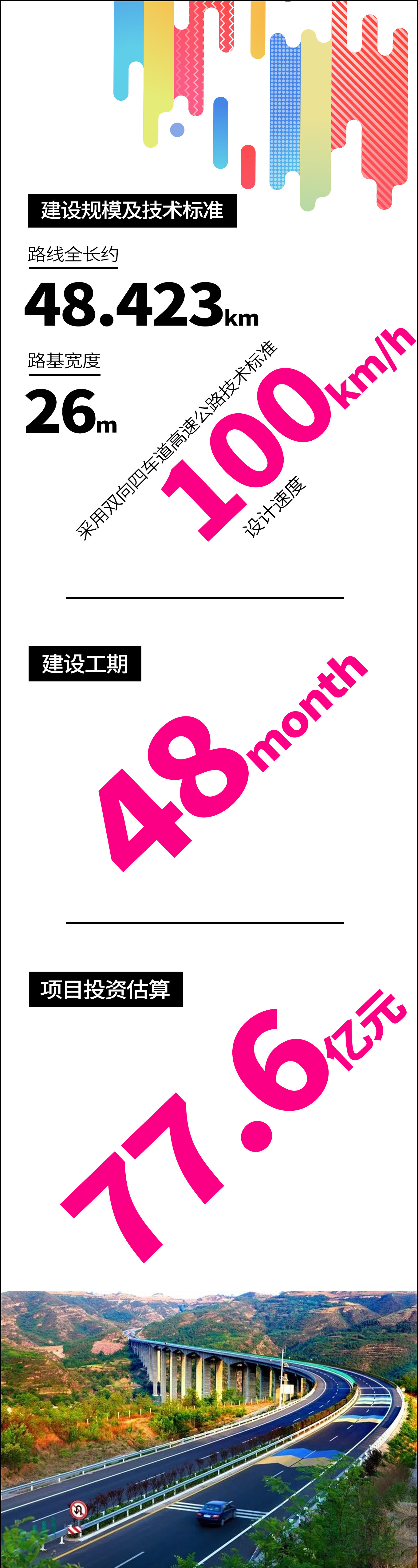路线全长约48.423公里,其中济源市境约14.34公里,洛阳市境约34.083公里。采用双向四车道高速公路技术标准,设计速度100公里/小时,路基宽度26米。项目计划于2021年6月开工建设,2025年6月建成通车,工期48个月。其中洛阳市境约55.5亿元,总投资约77.6亿元。(转载请注明见道网 www.seetao.com )见道网机械栏目编辑/邢文涛