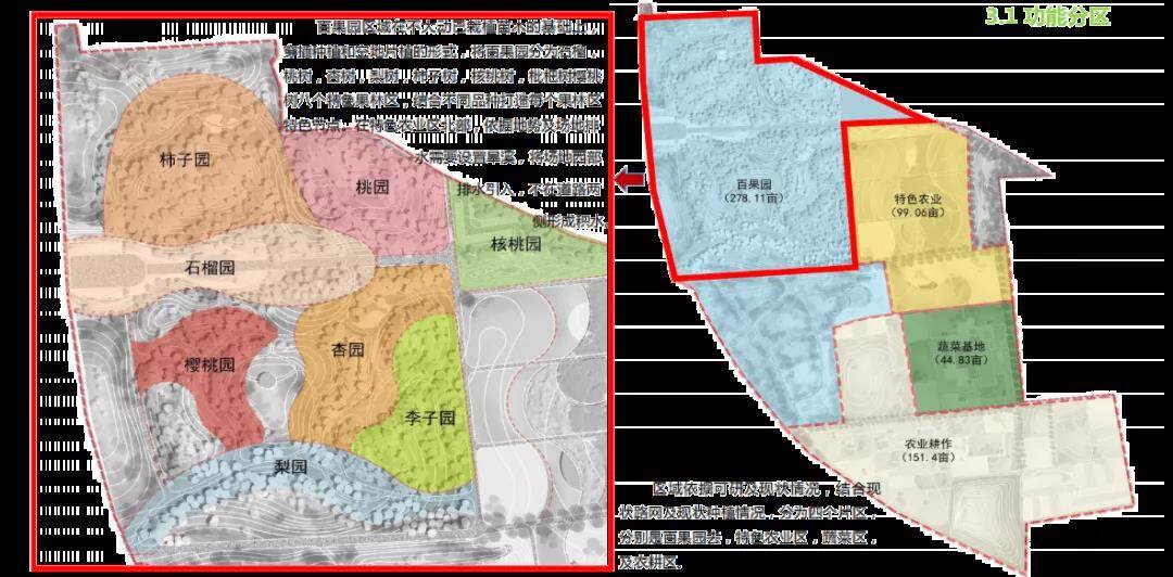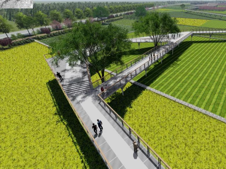 中铁十四局根据设计方案,将该项目建设主要划分三大功能区进行建设,包括,一是项目恢复农田使用功能建设,包括土地平整、田间修筑、地力保持、改善灌溉、农田防护与生态环境保持工程。二是农业休闲生态园按功能划分为“三区一园”,分别为农业耕作区(种植彩色小麦、玉米),特色农业区(种植油菜花、芝麻、油葵),绿色蔬菜区(种植草莓、西红柿、黄瓜、白菜),“百果园”(种植柿子园、杏树园、李子园、桃树园、樱桃园、苹果园、核桃园、石榴园、枇杷园)。三是相关配套设施。该项目设计从农田保护利用出发,宜田则田,宜绿则绿,用景观艺术效果打造形成沣东“沣彩百果园”。