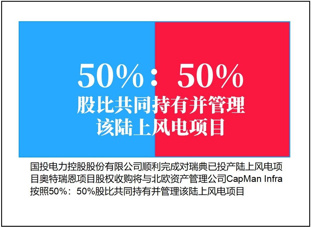 国投电力紧跟国投集团“开拓国际市场、实施转型升级、加快全球运营”战略步伐,着力投资与开发海上风电等境外清洁能源。2020年12月16日,国投电力控股股份有限公司顺利完成对瑞典已投产陆上风电项目奥特瑞恩(Överturingen)项目股权收购,将与北欧资产管理公司CapMan Infra按照50%:50%股比共同持有并管理该陆上风电项目。