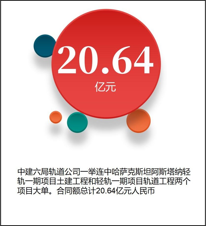 中建六局轨道公司深入践行工程局“海外优先突围”战略,一举连中哈萨克斯坦阿斯塔纳轻轨一期项目土建工程和轻轨一期项目轨道工程两个项目大单。合同额总计20.64亿元人民币。