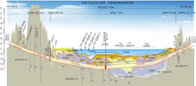 全长16.18公里的金塘海底隧道,比港珠澳大桥的隧道还要长10公里,是世界最长海底高铁隧道。港珠澳大桥越海隧道全长6.7公里,属沉管公路隧道,金塘隧道是高铁盾构隧道,全线五分之一深入海底,并将实现超大直径盾构海底地中对接,大直径盾构隧道管片内侧设置全断面二次衬砌结构,盾构管片接缝外侧设置多道防水体系,铁路盾构隧道内部设置适用于机动车辆的纵向贯通疏散通道等多项国内首创。