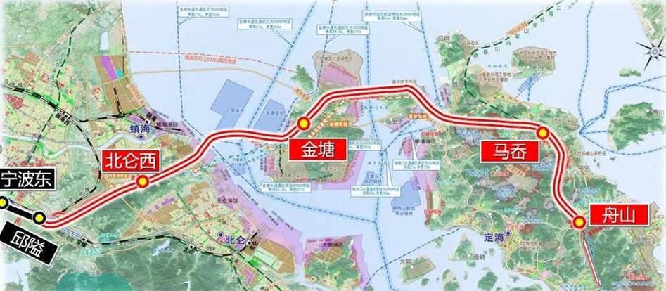 The Ningbo-Zhou Railway starts from Ningbo East Station in the west, passes through Yinzhou District, Beilun District, Zhoushan City, Jintang Island, Cezi Island, Fuchi Island and Zhoushan Island. The design speed is 250 kilometers per hour. There are 7 stations on the whole line, of which Beilun West 4 stations, Jintang, Ma'ao, Zhoushan, and 3 existing stations in Ningbo East, Yunlong and Qiuai. The total length is 76.4 kilometers, of which the newly-built line is 70.1 kilometers long. The line is connected to the Ningbo-Taiwan-Wenzhou Railway to the south, to the Yongjin Railway to the southwest, to the Hangzhou-Ningbo Passenger Dedicated Line to the west and northwest, and connects to Hangzhou-Changzhou, Nanjing-Hangzhou, Shanghai-Hangzhou, Shanghe-Hangzhou lines through the Hangzhou hub. . The total investment of the project is about 27 billion yuan, and the construction period is 6 years.