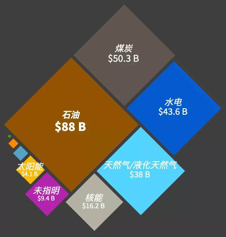 从能源类型来看,中国在海外的石油投资最多(880亿美元),其次是煤炭(503亿美元)、水电(436亿美元)、天然气(380亿美元)、核能(162亿美元)、太阳能(41亿美元);还有94亿美元的投资类型未明确指明。