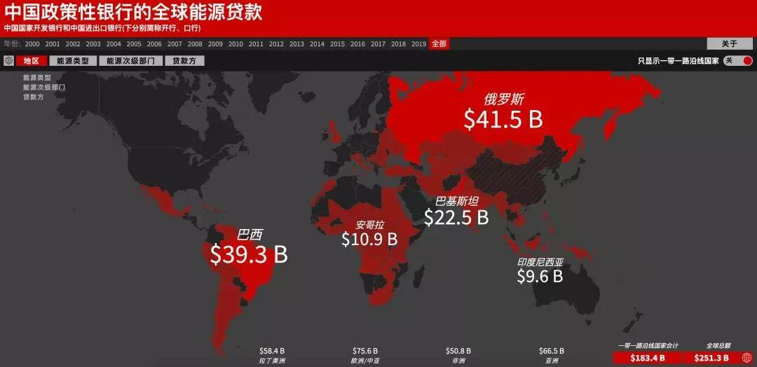 中国海外直接投资中能源项目占据了半壁江山,能源项目成为中国海外直接投资的重点。根据波士顿大学全球发展政策研究中心的汇总数据,2000年到2019年这20年间中国在海外的能源投资总额为2513亿美元,其中一带一路发展中国家为1834亿美元。
