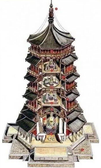 应县木塔,即佛宫寺释迦塔,坐落于山西省应县佛宫寺内。建于辽代,平面呈八角形,外观5层,夹有暗层4层,实为9层,通高67.13米。塔内明层均有塑像,是中国现存最古老、最高的一座木结构大塔。