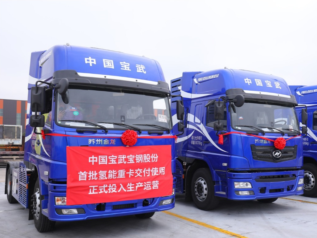 2020年12月29日下午,随着中国宝武党委书记、董事长陈德荣响亮宣布:“宝钢股份宝山基地氢能重卡投运,出发!”60辆由苏州金龙为宝钢股份定制的42吨半挂氢能重卡徐徐驶出滩涂停车场,中国宝武首批氢能重卡实现交付,并将正式投入运营。这是全球一次性批量投入最大的氢能重卡商业化运营项目,标志着由宝武清能承担的上海市重点产业化科研项目“氢燃料重卡在宝钢基地可靠性、适应性验证及示范应用”结出硕果。