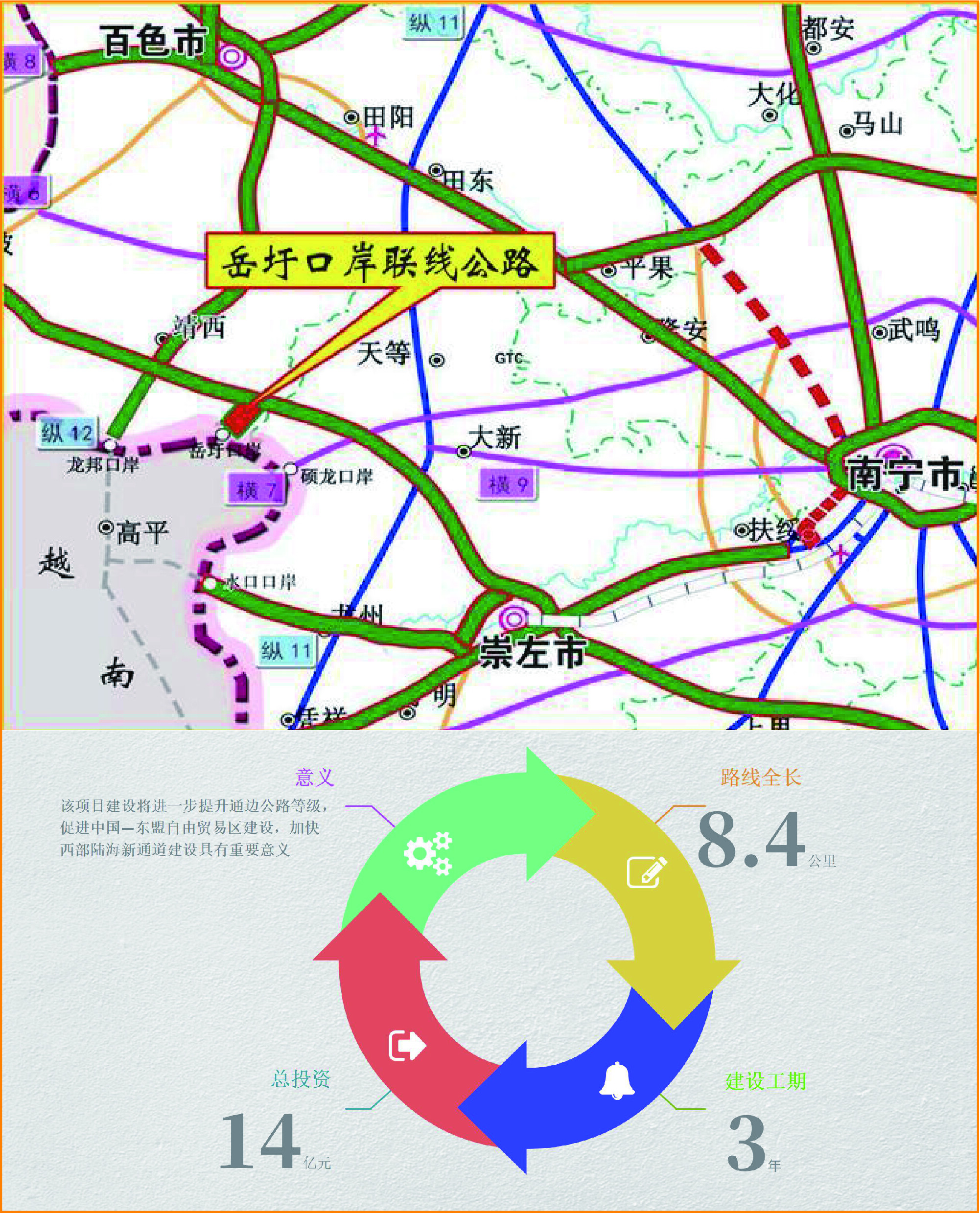 岳圩口岸联线公路起点位于靖西市同德乡新民村,接合浦至那坡高速公路,路线往南经汉邦村,终点位于岳圩镇,与G219沿边公路相接。路线全长8.4公里,估算总投资约14亿元,计划建设工期3年。