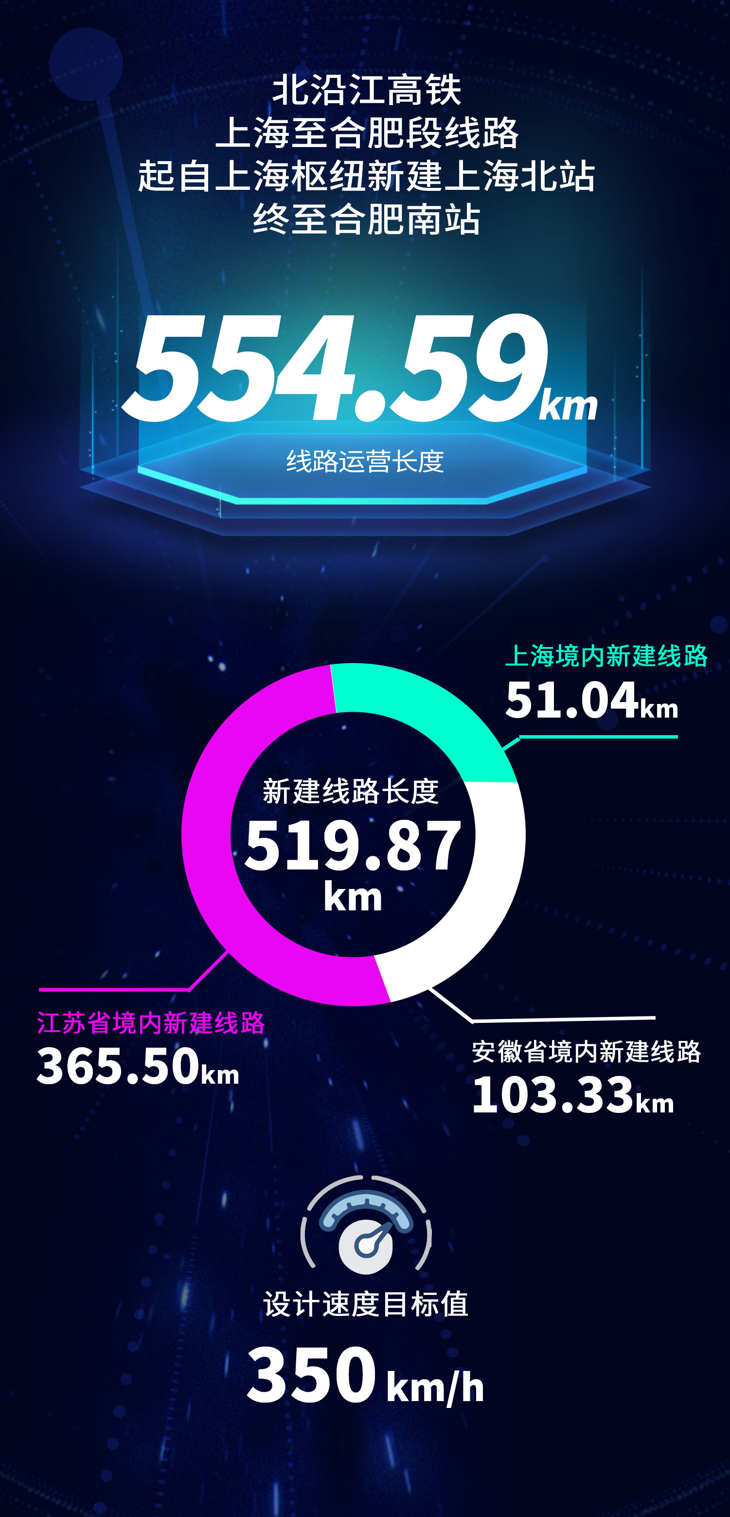 The Shanghai-Hefei section of the North River High-speed Railway starts from the new Shanghai North Station in the Shanghai hub and ends at Hefei South Station. The operating length of the line is 554.59km and the length of the newly built line is 519.87km. Among them, the newly built line in Shanghai is 51.04km, the newly built line in Jiangsu Province is 365.50km, and the length of the newly built line in Anhui Province is 103.33km. The design speed target value is 350 km/h.
