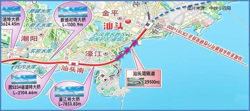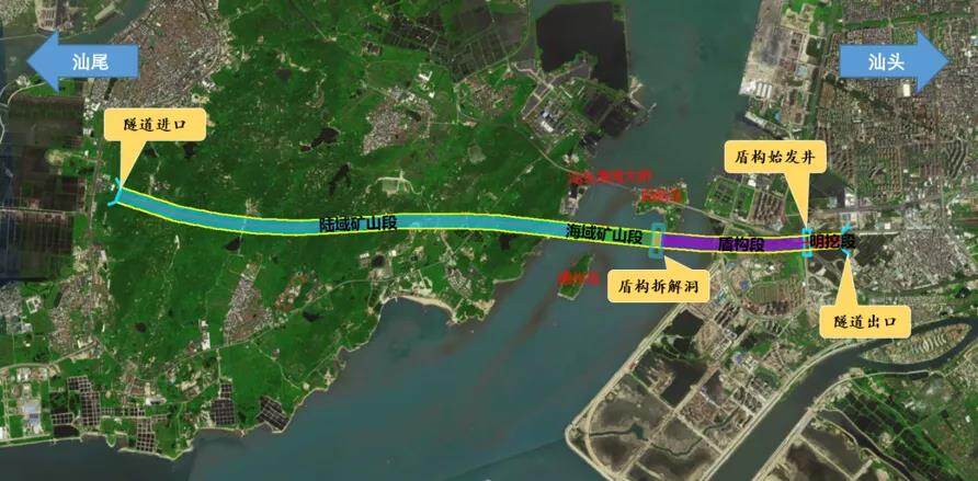 中铁十四局承建汕汕铁路汕头湾海底隧道,位于广东省汕头市汕头湾内,是世界首座设计标准为350公里时速、跨海大直径盾构的高铁海底隧道,全长约9.8公里。其中盾构段长度2169米,包含40米盾构空推段。隧道分为海域段和路域段,由南北岸相向而行施工,从南岸往北采用矿山法,从北岸往南采用盾构法。