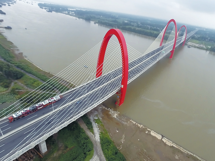 二大:单跨跨度大、双跨连续跨度大。大桥左汊斜拉桥单跨跨度1120米,双跨连续跨度2240米,在同类桥梁中均为世界之最。