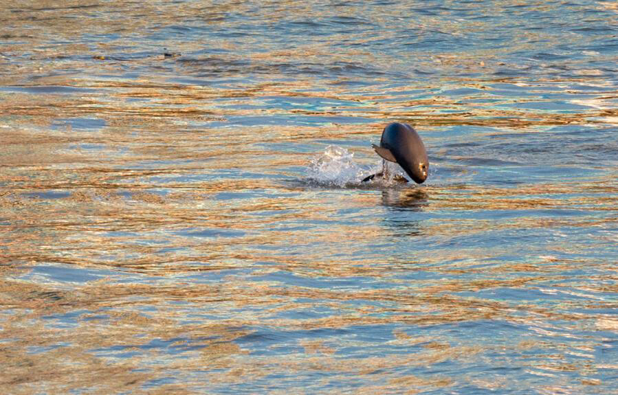 江豚在湖北省宜昌市西陵区镇江阁外逐浪嬉戏(2020年8月3日摄)