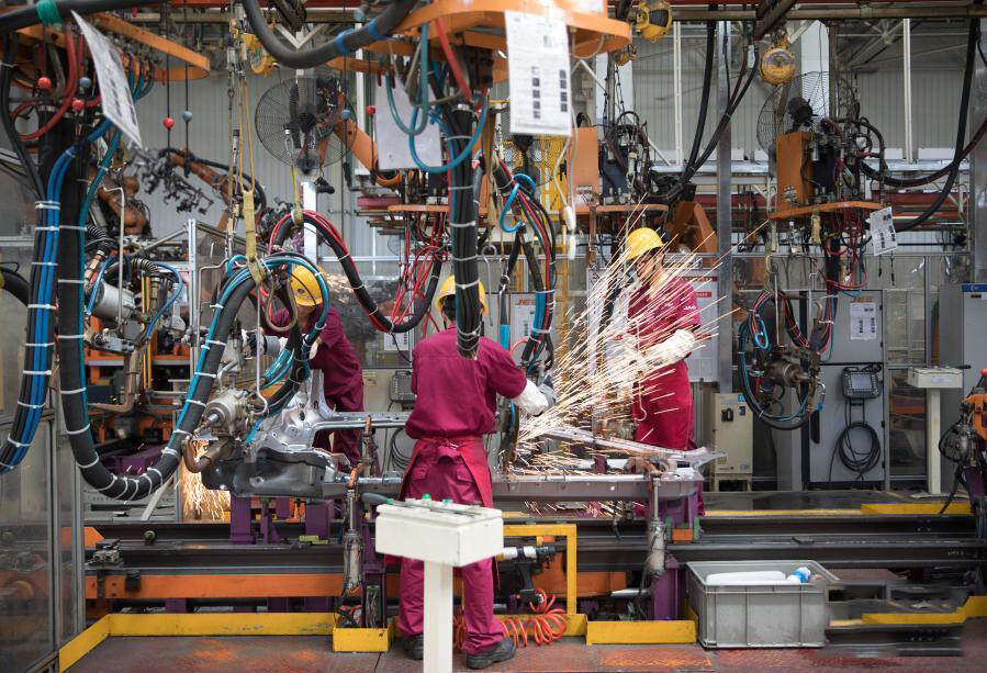 在安徽江淮汽车集团股份有限公司安庆分公司新能源汽车生产车间,工人在焊接新能源纯电动车配件(2018年8月7日摄)