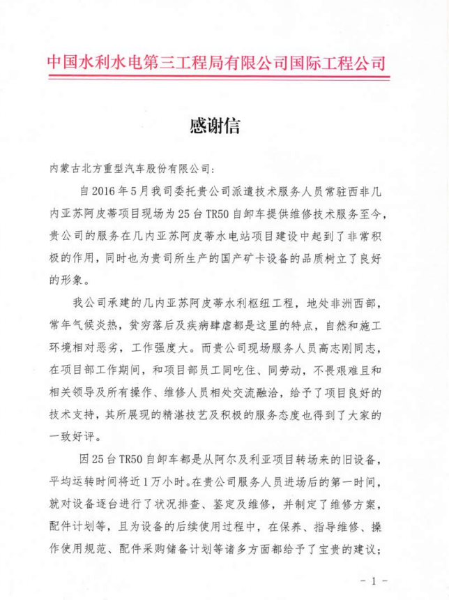 自2016年5月至今,内蒙古北方重型汽车股份有限公司派遣技术服务人员常驻西非几内亚苏阿皮蒂项目,为25台TR50自卸车提供维修技术服务,起到了非常积极的作用,也为内蒙古北方重型汽车股份有限公司所生产的国产矿卡设备的品质树立了良好的形象。