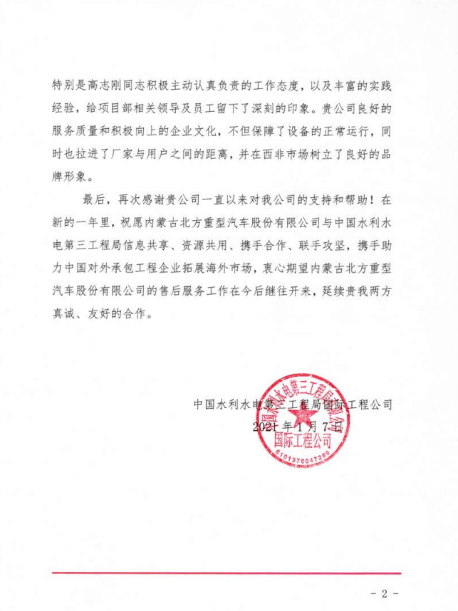 为此,2021年1月7日,中国水利水电第三工程局国际工程公司特书感谢信一封,希望与其继续携手助力中国对外承包工程企业拓展海外市场。