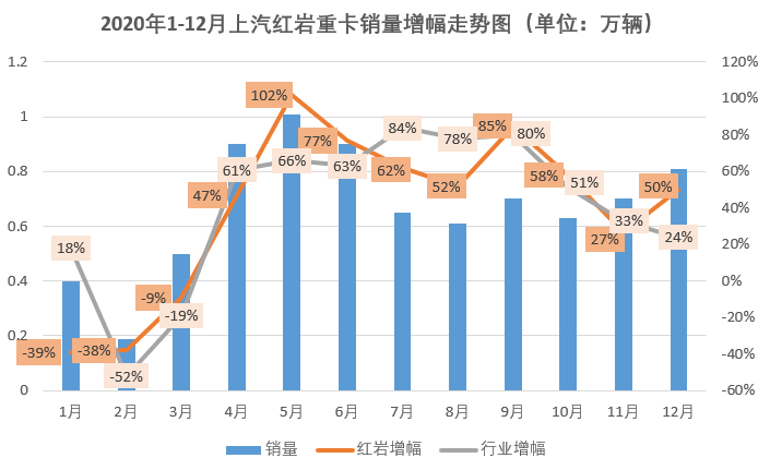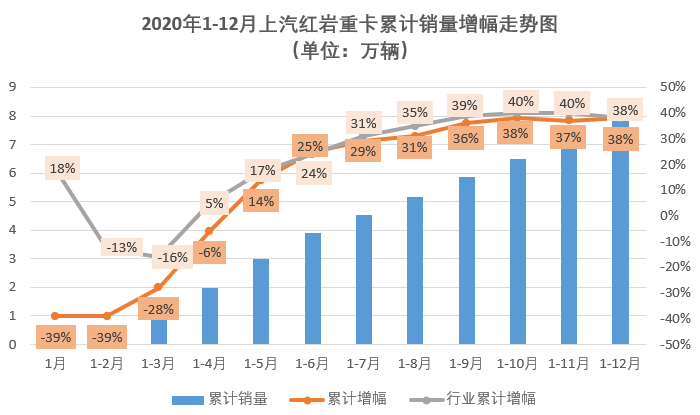2020年,上汽红岩全年销量实现了38%的增长,与重卡市场整体增幅持平,在主流重卡企业中,完成这一“操作”(不低于行业整体增幅)的企业仅有4家。然而,在跌宕起伏的2020年,上汽红岩与不少企业一样,都经历了深渊和巅峰。