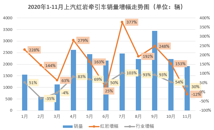 上图可见,2020年1-11月,上汽红岩有9个月销量增幅优于牵引车市场的整体表现,并有8个月增幅破百。其中在疫情最严重的2、3月份,牵引车市场遭遇连降的时候上汽红岩坚挺地实现了一季度三连增。2020年,上汽红岩牵引车以115.7%的累计增幅“领涨”市场,115.7%的累计增幅将使上汽红岩大概率成为主流企业中唯一实现增幅破百(销量翻番)的企业。