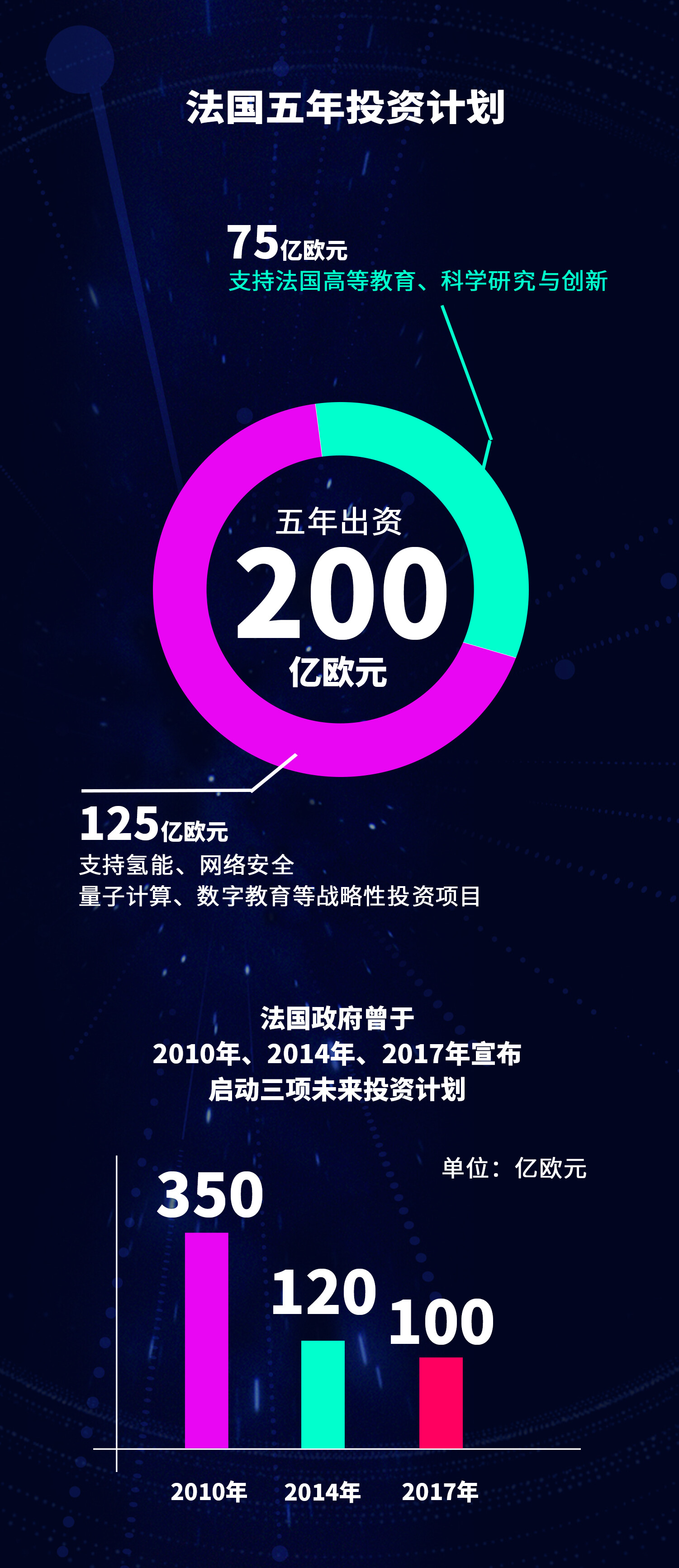 2021年1月8日,据报道,当日法国总理卡斯泰宣布正式启动第四项未来投资计划。在该计划框架下,法国政府将在未来五年出资200亿欧元助力法国战略新兴产业发展。其中,75亿欧元将用于支持法国高等教育、科学研究与创新,125亿欧元用于支持氢能、网络安全、量子计算、数字教育等战略性投资项目。