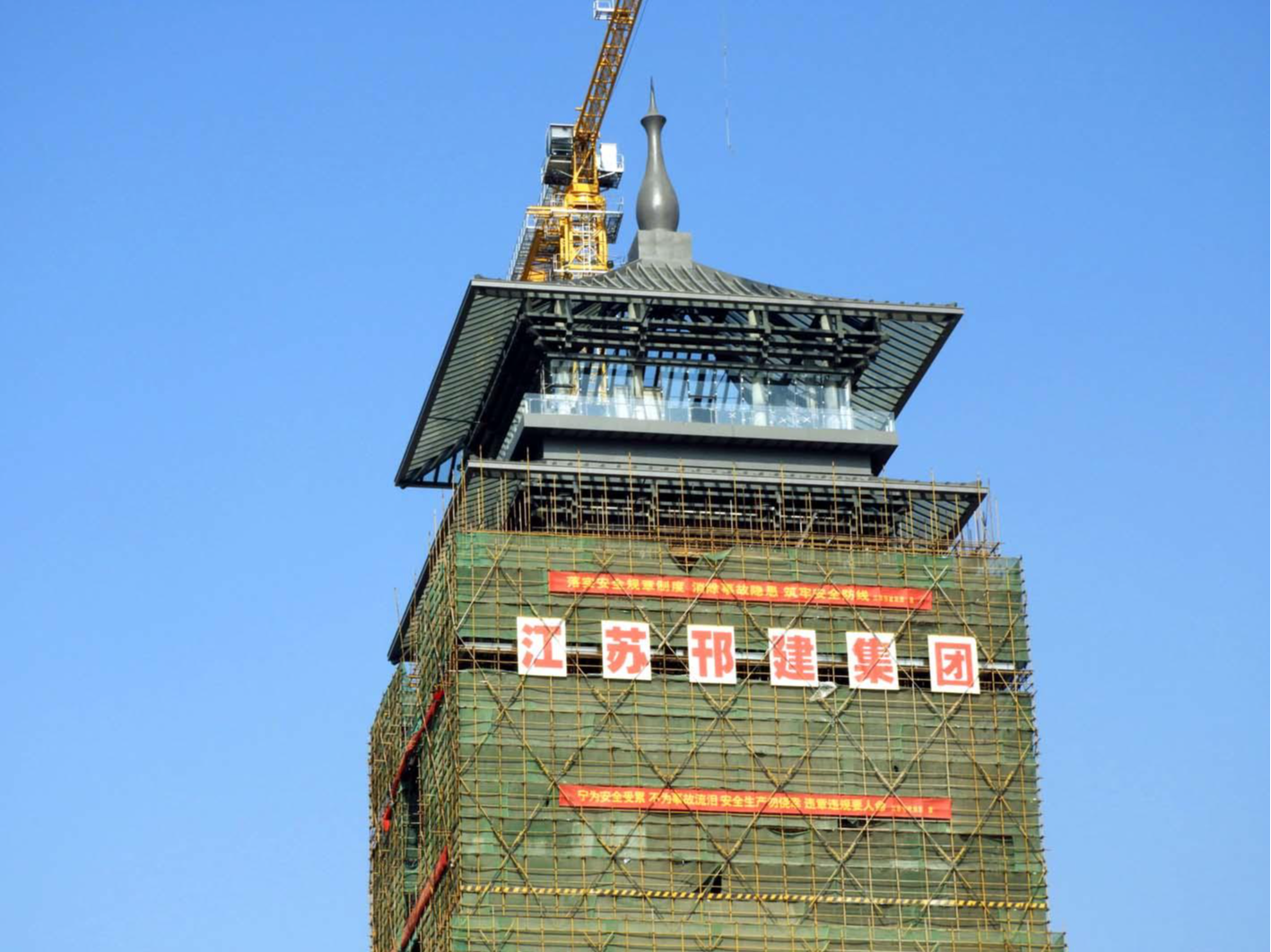 大运塔地下1层,地上明层9层,同时有两个暗层。大运塔塔刹于去年10月完成吊装,塔刹高10多米,将大运塔高度提升到112.3米。施工单位江苏邗建集团项目经理薛庆兵介绍,大运塔脚手架计划下月初全部拆完,塔身全部展现,塔的内部装饰也已启动,计划2021年“4·18”完成。