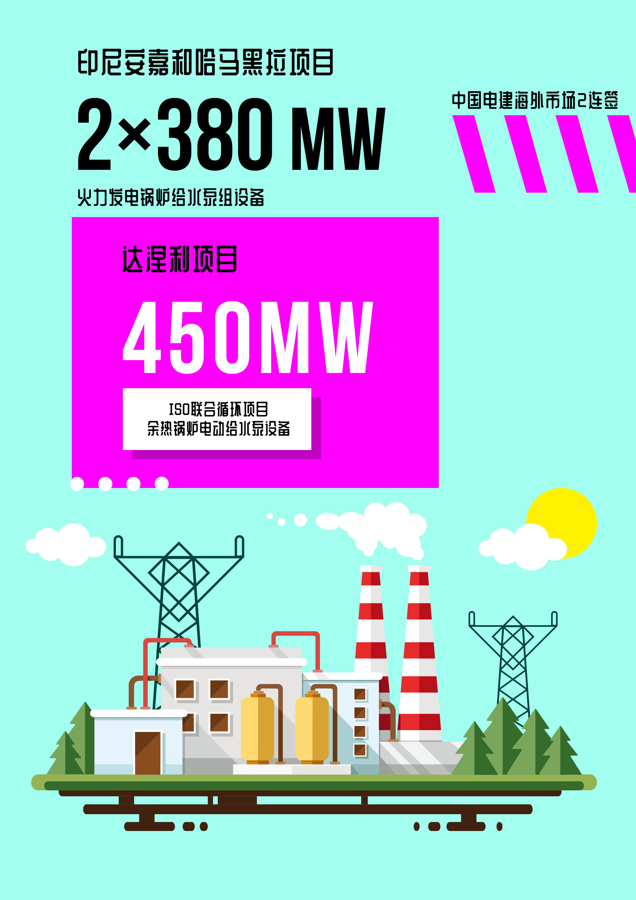 印尼安嘉和哈马黑拉项目本期建设2×380 MW火力发电锅炉给水泵组设备。项目厂址位于印度尼西亚东部北马鲁古省中部地区。达涅利项目本期建设450MW ISO联合循环项目余热锅炉电动给水泵设备。