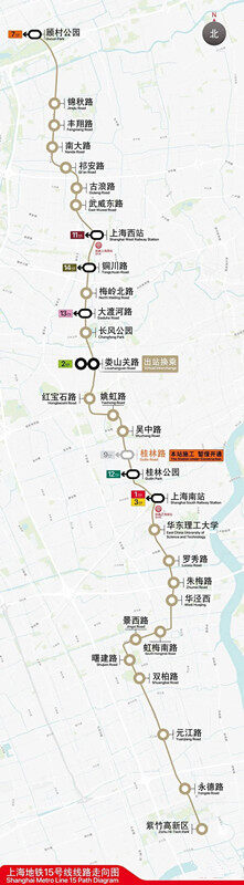 15号线是上海的第四条轨道交通 全自动无人驾驶线路,也是首条全线全功能一次性开通最高等级全自动无人驾驶系统的地铁线路。轨道交通15号线工程起自闵行区紫竹高新区站,止于宝山区顾村公园站,途经闵行区、徐汇区、长宁区、普陀区、宝山区等5个行政区。线路全长超过42公里 ,设地下车站30座,其中8座车站与路网中既有和在建的9条线路形成换乘。