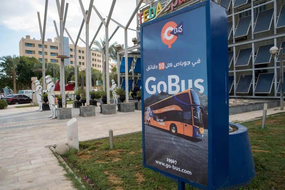 1月14日拍摄的中埃·泰达苏伊士经贸合作区内的Go Bus标志牌。