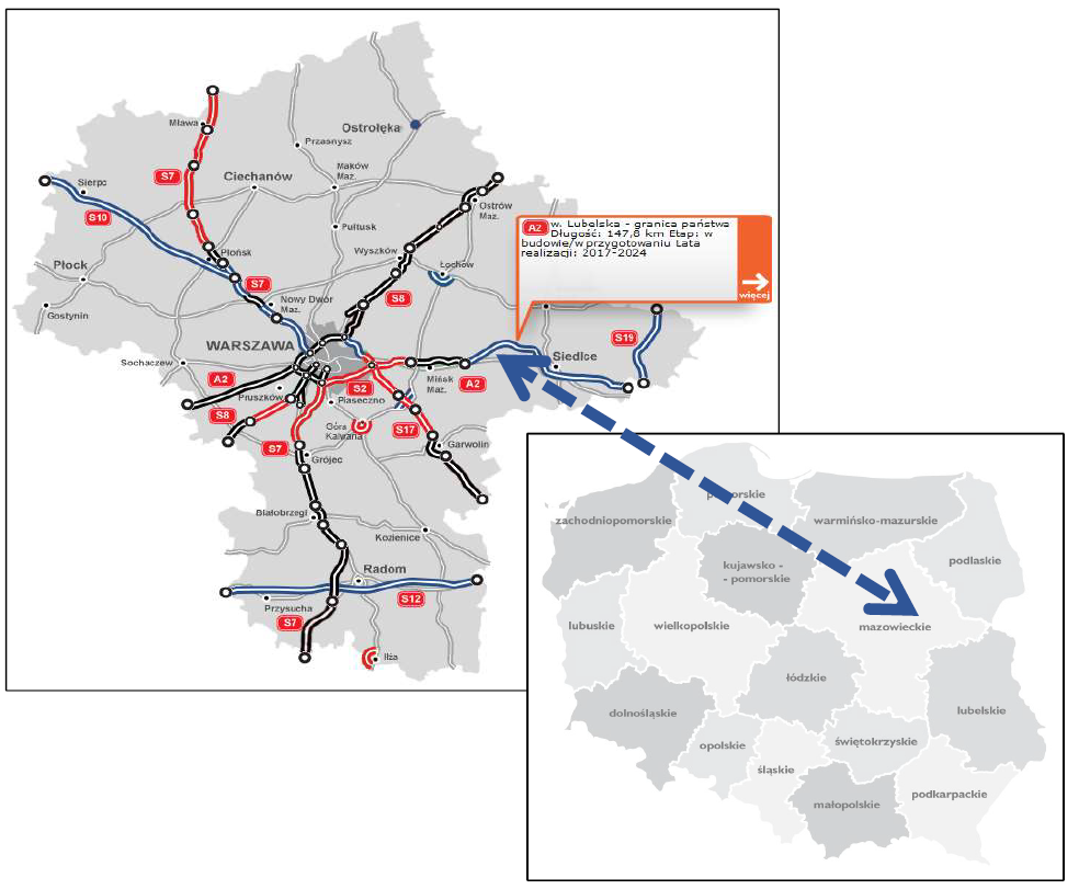 该项目位于波兰马佐夫省的首府华沙市以东75公里处,属于A2高速公路雷肖维克至谢德尔采区间的第4段,长约12.89千米,双向四车道,其中包含沥青路面、设施重建、地面加固、桥梁、涵洞、人行道、绿化种植等工程。项目包含8座交通桥,12座涵洞。