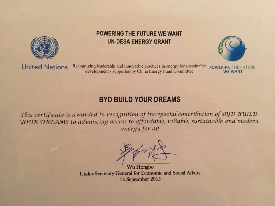 BYD's actions and efforts in response to global climate change have won wide acclaim from the international community. In September 2015, the then UN Secretary-General Ban Ki-moon awarded BYD the "UN Energy Special Award" at the UN headquarters in New York. This was the first award for the new energy industry since the founding of the United Nations in 70 years. In January 2014, Mr. Wang Chuanfu won the "Zayed Future Energy Award" Personal Lifetime Achievement Award for his outstanding contribution to the promotion of sustainable technology development. In January 2016, BYD won the "Zayed Future Energy Award" large-scale enterprise award again, this is the first time a Chinese company has won this award. The "Zayed Future Energy Award" is recognized as the world's most authoritative and valuable environmental field's highest award. It is reviewed by a jury composed of world-renowned renewable energy experts.