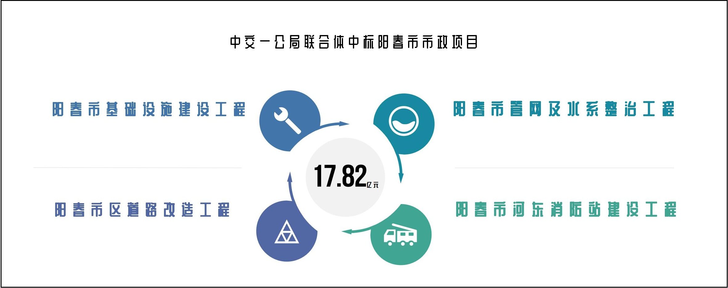 2021年2月2日,中交一公局联合体中标阳春市市政基础设施新建与升级改造工程项目,该项目包括阳春市基础设施建设工程、阳春市区道路改造工程、 阳春市管网及水系整治工程和阳春市河东消防站建设工程,共计四个子项目。总投资17.82亿元。