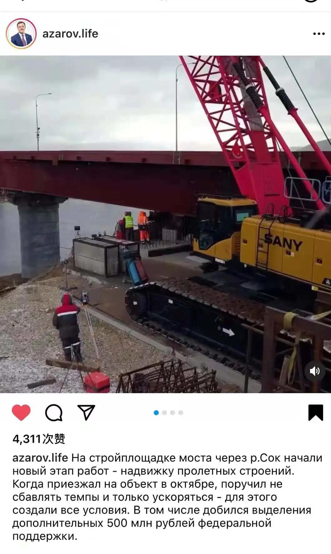 近期,俄罗斯州州长阿扎罗夫更新了一条INS写道:“索克河大桥项目已进入新一阶段施工。我曾下令绝不可以放缓施工,并为此创造了所有有利条件。”