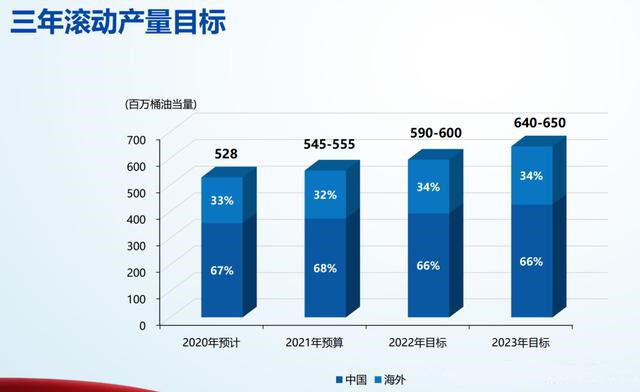 From the perspective of production targets, CNOOC is expected to achieve 545-555 million barrels of oil equivalent in 2021, of which petroleum liquids account for 80% and natural gas account for 20%. The targets for 2022 and 2023 are 590-600 million barrels of oil equivalent and 640-650 million barrels of oil equivalent, with an average annual increase of about 40-50 million barrels of oil equivalent, which is more than the average of the past few years.