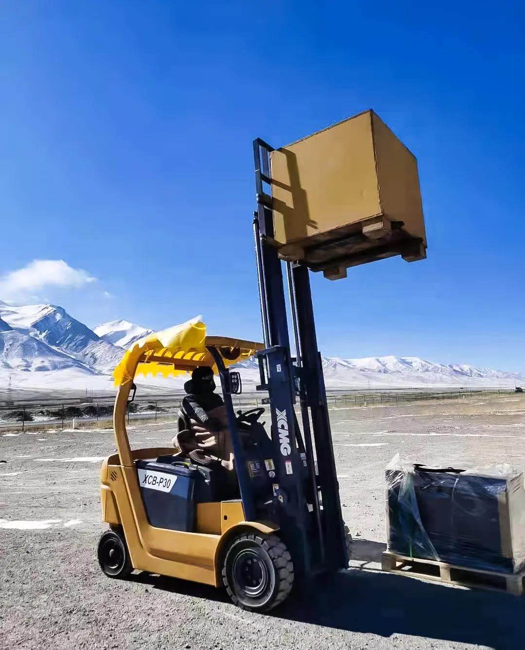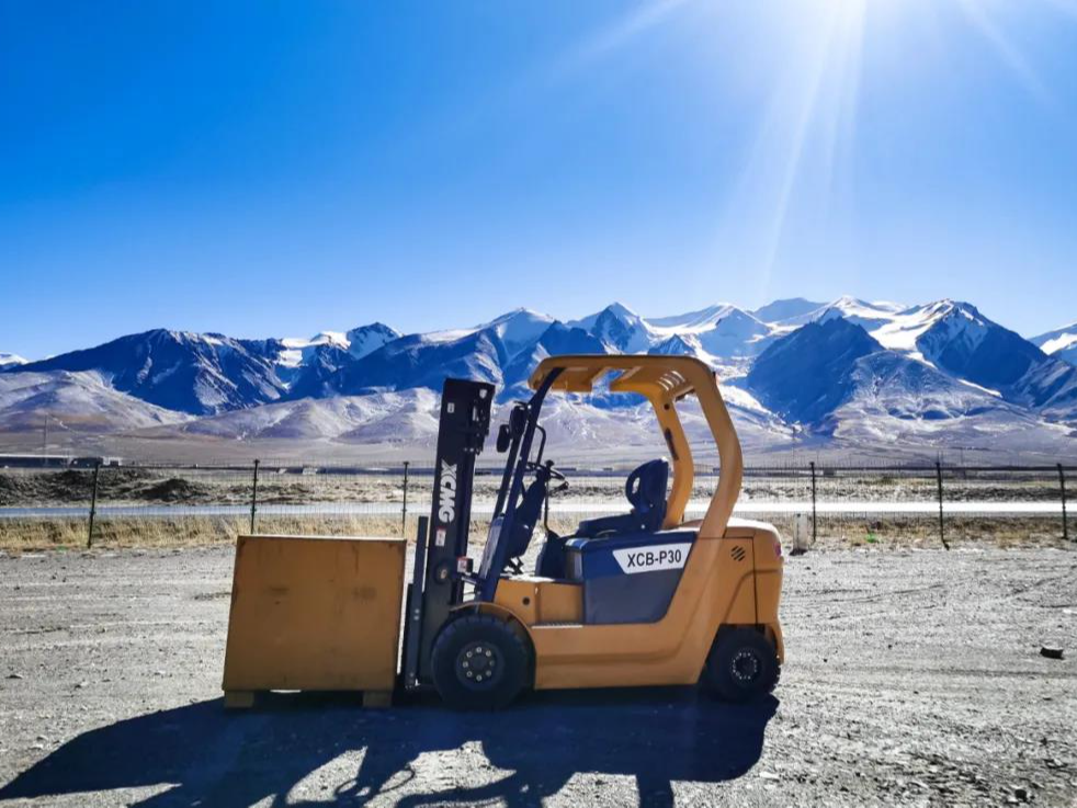 海拔四千多米的玉珠峰下,湛蓝的天空宁静幽深,连绵的雪山一望无际,脚下的沙石被刺骨的寒风吹起,高原稀薄的空气让正常的走路都变得举步维艰,在这样极端的环境中,徐工叉车正在紧张的上演着“极限挑战”。