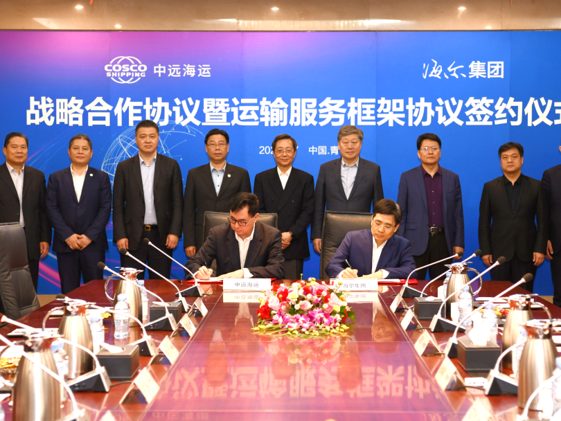 中远海运集团党组成员、副总经理黄小文,海尔集团董事局副主席、总裁周云杰代表双方在协议上签字。期间,中远海运集团旗下中远海运集运与海尔集团旗下海尔海外电器产业有限公司签署了海上货物运输及多式联运服务框架协议。