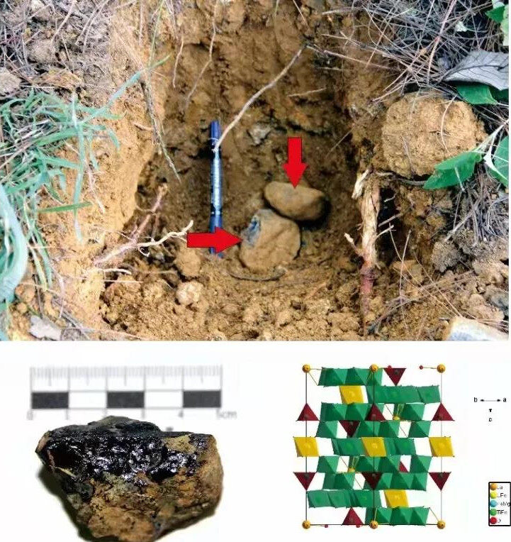 海塔铀矿是中国核地矿系统成立近70年来发现的第7个新铀矿物,也是发现的第3个原生新铀矿物。该铀矿发现于四川省攀枝花市米易县海塔地区,呈巨粒集合体形态,产出于中元古代云母片岩与新元古代混合花岗岩接触带内,黑色,金属光泽。经过系统的矿物学研究后,研究团队对该矿物族中元素的占位提出了全新见解,确定其为一种自然界尚未被发现的尖钛铁矿族新矿物。