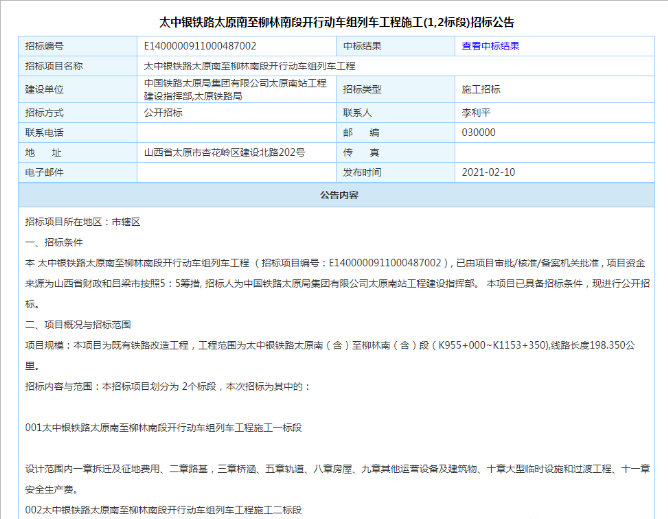 2021年2月10日,《太中银铁路太原南至柳林南段开行动车组列车工程施工(1、2标段)招标公告》正式发布。